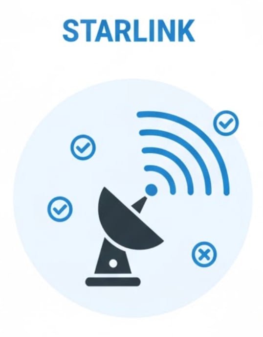 Starlink delivers broadband-class throughput and latency that support conferencing and cloud workflows. It is independent of your local utility drop because you provide the power, which can allow continued service when neighborhood cable or fiber is dark. It is not independent of ground infrastructure in absolute terms, because user links still traverse gateways tied to terrestrial networks. That mixed dependency is what you design around: enough energy on site to run the terminal when you need it and a second transport path to absorb policy shifts, congestion, or gateway issues.